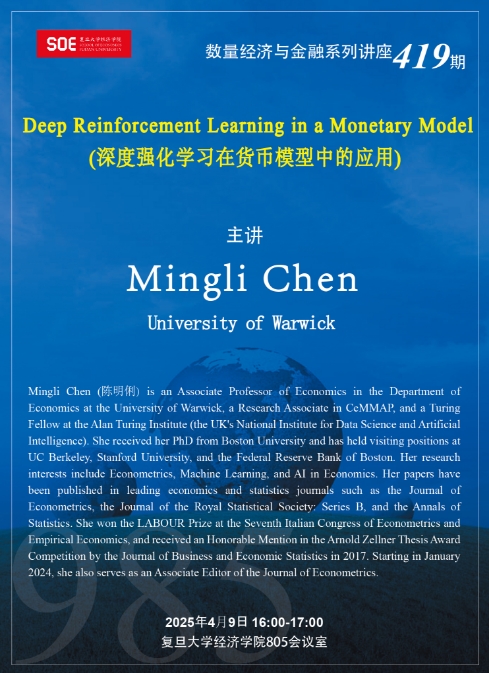 Mingli Chen is an Associate Professor of Economics in the Department of Economics at the University of Warwick, a Research Associate in CeMMAP, and a Turing Fellow at the Alan Turing Institute (the UK's National Institute for Data Science and Artificial Intelligence). She received her PhD from Boston University and has held visiting positions at UC Berkeley, Stanford University, and the Federal Reserve Bank of Boston. Her research interests include Econometrics, Machine Learning, and AI in Economics. Her papers have been published in leading economics and statistics journals such as the Journal of Econometrics, the Journal of the Royal Statistical Society: Series B, and the Annals of Statistics. She won the LABOUR Prize at the Seventh Italian Congress of Econometrics and Empirical Economics, and received an Honorable Mention in the Arnold Zellner Thesis Award Competition by the Journal of Business and Economic Statistics in 2017. Starting in January 2024, she also serves as an Associate Editor of the Journal of Econometrics.