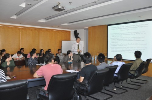 在随后的学术报告环节,张中祥教授作了题为“美国的碳关税建议:WTO框架下的考量与中国的应对”的报告。张教授从环境-贸易关系、美国气候法案中的碳排放边境调节、美国减排规则与WTO条款和案例法、对中印等发展中经济体的影响、实施碳排放边境调节是否有效和技术层面面临的挑战、国际气候变化谈判中的缺陷等角度,对环境与贸易这一公共经济领域中重要的内容作了详尽的报告。张教授认为,中国应充分利用气候变化国际框架公约搭建的平台,在联合国气候变化框架公约下制定评判各国实施减排措施可比性的准则,而不是完全依赖于WTO。如果完全依赖于WTO,对发展中国家所提起诉讼得出不利判决的可能性是存在的。其次,中国一再重申,中国已采取许多减排措施。虽然这是无争的事实,但充其量也只能赚得美国廉价的肯定。但是,如果在联合国气候变化框架公约下能够达成评判各国实施减排措施可比性的准则,那么中国已采取的许多温室气体减排措施就可折算成美国拟建的碳排放贸易下相应的碳排放额度价格,从而变成对中国实实在在的利益。另一方面,中国要想消除美国通过实施碳关税指责中国的把柄,摆脱碳关税的制约,变被动为主动,那么就应适时向世界预示何时对温室气体排放总量进行控制。张教授建议中国可择时向世界预示在2030年左右对自己的温室气体排放总量控制的承诺。在国际气候变化谈判中,作为应对策略,中国应提议发达国家到2050年其温室气体排放量在1990年的基础上减少80%,同时所有主要排放国家到2050年人均温室气体排放量不应超过全球届时的平均水平。以这样的远期目标承诺,可以使自己在谈判中处于更主动的地位,同时,对发达国家的远期减排目标提出更高的要求。另外,从产业结构来看,碳关税对高耗能的制造业影响大。尽管中国以制造业而印度以服务业为特点的发展模式孰优孰劣是学界永无休止争论的话题,但中国制造业占GDP的比例是印度的2倍却是无争的事实。因此,碳关税对中国的影响预料会比印度大很多。鉴于此,张教授认为中国需认真考量是否仍坚持与印度就解决碳关税议题的途径保持一致这一立场。