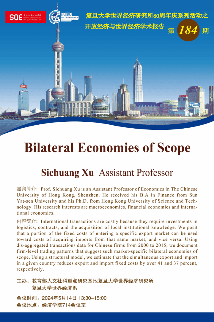 个人简介:Prof. Sichuang Xu is an Assistant Professor of Economics in The Chinese University of Hong Kong, Shenzhen. He received his B.A in Finance from Sun Yat-sen University and his Ph.D. from Hong Kong University of Science and Technology. His research interests are macroeconomics, financial economics and international economics.