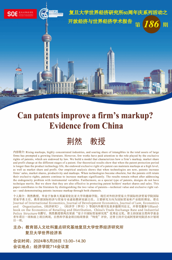 内容简介: Rising markups, highly concentrated industries, and soaring share of intangibles in the total assets of large firms has prompted a growing literature. However, few works have paid attention to the role played by the exclusive rights of patents, which are endowed by law. We build a model that characterizes how a firm’s markup, market share and profit change at the different stages of a patent. Our theoretical results show that when the patent protection period is longer than the product technology life, the endowed exclusive right of a patent can maintain markups at a high level, as well as market share and profit. Our empirical analysis shows that when technologies are new, patents increase firms’ sales, market shares, productivity and markups. When technologies become obsolete, but the patents still retain their exclusive rights, patents continue to increase markups significantly. The results remain robust after addressing the endogeneity problem with instrumental variables. Furthermore, as a special type of patents, designs do not have technique merits. But we show that they are also effective in protecting patent holders' market shares and sales. This paper contributes to the literature by distinguishing the two value of patents---technical value and exclusive right value---and demonstrating patents increase markup through both channels.