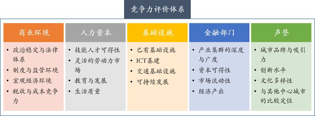 2021年全球金融中心指数报告将金融中心竞争力评价体系分解为商业环境、人力资本、基础设施、金融部门及声誉5个维度,而人力资本中的技术人员可得性和商业环境中的制度与监管环境是其中最重要的两个因素(图1)。