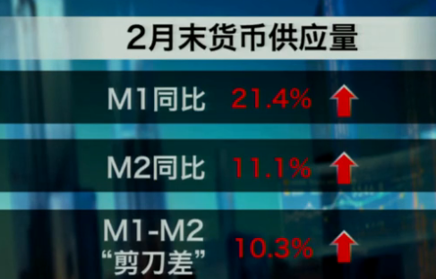 M2货币供应量同比增长11.1%,低于1月份的11.3%,M1同比增长了21.4%,M0同比增长了3.3%,M1和M2的剪刀差从1月份的3.2% 猛扩至二月份的10.3%,终结了此前连续7个月收窄的局面。
