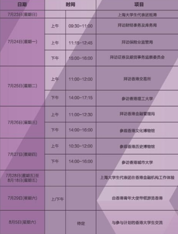 这个暑假很荣幸作为赴港金融交流班的一员到香港开展为期一个月的交流活动,该活动具体的时间安排如下: