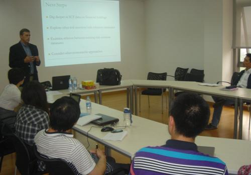 其次,Randy向我们列举了很多相关文献。分成作者,方法/数据和主要成果三个方面阐述。最后,Randy在三个假设下引入了6个风险规避计量模型。模型数据的来源主要是SCF—消费者资金调查。模型涉及到股市风险,人口和经济的因素,生命周期因素等多个变量,每一种变量的作用和影响度都用表格进行了清楚的说明。讲座结束后,参加讲座师生就报告中的内容同Randy教授做了进一步的交流和讨论。