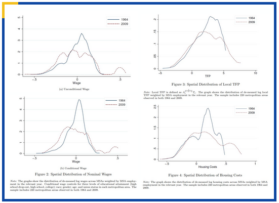 这篇文章从劳动力空间误配的角度来探讨资源误配对美国总产出、总福利的影响。在美国,不同的城市之间名义工资和劳动生产力有显著的差别,而作者认为这样的显著差别以及随时间而加剧的分散化程度反映了劳动力误配情况的存在。