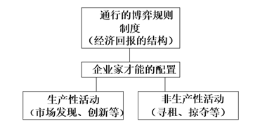 鲍莫尔认为,任何社会都不缺企业家精神(才能),企业家精神供给的多寡对各个社会经济发展差异的影响很小,是各个国家或地区的企业家精神的配置方式——从事生产性活动,还是非生产性活动乃至破坏活动——决定了这个国家或地区的经济发展水平。而决定企业家精神配置方式的是这个国家或地区的制度环境,是所处社会通行的一整套规则及由该规则所产生的经济回报结构。如果现有制度环境更加有利于从事寻租活动、通过窃取别人的财富来获取自己的利益,那么,企业家将把才能用于怎么把蛋糕中更大的一块分给自己,而不是去从事做大蛋糕的工作,即非生产性活动。如果有更加完善的公司法、信托法,以及对于这些法律的有效实施机制,投资人的利益能够得到充分保护,那么企业家将不去从事侵犯投资人利益的事,而是为投资人创造更大价值,即从事生产性活动。因此,制度环境是能否驱动企业家从事生产性活动、进而推动经济发展的决定性因素。