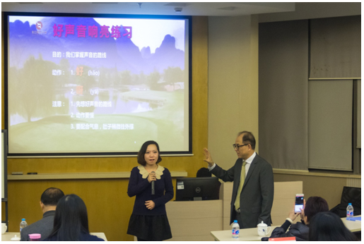 怎么测试用气发声?李老师告诉大家一个方法就是靠墙站直,挺胸收腹背,一只手放在喉咙上,另一只搭在肚子上,大声做“啊”重复练习。练习时,如果搭在喉咙上的手感觉喉咙在震动,而搭在肚子上的手并没有感觉肚子在收缩,说明发音时错误的。李老师现场给大家演示了好几种吸气、练气的方法,如闻香法、吹蜡烛法、数葫芦法、远处喊人练气法。在模拟远处喊人练气息时,李教授请男女两位同学模拟山间隔空喊话,男生饱含深情拉着浓厚长音叫女方的名字,欲邀请女方一起爬山,而女方则用悠扬且清脆的声音答复对方,将这一暧昧场景演绎的栩栩如生,引发阵阵喝彩。