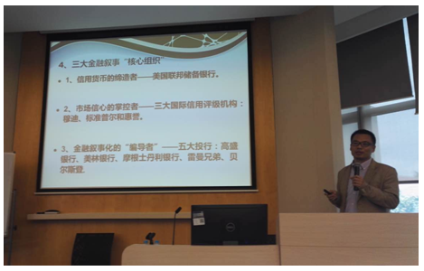 此后,申先生分享了欲望与理性之间的辩证关系以及三大金融叙事“核心组织”。申先生认为,灵魂如同一叶小舟,飘在浩瀚无际的欲望之海上,只有抛下一只坚实的锚——信仰,才能阻止这叶小舟任凭大海的支配。20世纪80年代,张立文教授提出了和合学思想,在海德格尔对“爱智”精神思想挖掘的基础上,对西方自柏拉图以来的形而上学的“爱”与“智”二元分裂运动进行批判,重构了人类的人文精神的丰富资源。三大金融叙事“核心组织”包括信用货币的缔造者—美国联邦储备银行,市场信心的掌控者—三大国际信用评级机构:穆迪、标准普尔和惠誉,以及金融叙事化的“编导者”—五大投行:高盛银行、美林银行、摩根士丹利银行、雷曼兄弟和贝尔斯登。