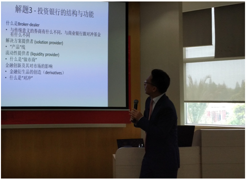 林老师以2015年末上映的电影《大空头》开头,引起了在座同学对主人公工作性质的浓重兴趣。林老师提到,投资银行容易与投行部门混淆,实际是美国产生的概念,被称为broker-dealer,可以理解为掮客,自营或者代客做交易,这种业务所在的部门是资本市场部,内容主要是债券、股票及其衍生品交易,标的包括房地产等传统产品及天气等新颖品种做衍生品交易。投资银行部主要从事新股发行、兼并收购等业务。《大空头》里的主人公即在资本市场部,从事信用衍生品交易;而林老师本人重点从事利率和外汇衍生品交易。每一条线的产品都针对不同客户,进行了细分。投资银行还担任解决方案提供者与流动性提供者两种角色,通过设计销售不同产品,满足客户不同需要。金融市场由众多金融机构组成,还有种类繁多的金融产品,在足够大的市场上有买卖双方,市场才能健康发展,投资银行扮演了做市商的角色,为做多方提供卖价,为做空方提供买价,促进了市场的流动性。
