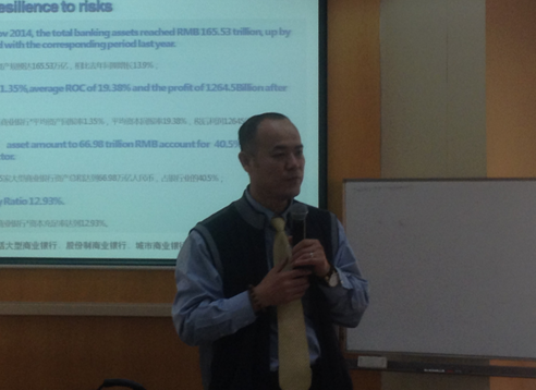 陈胜校友首先介绍道,我国目前银行体系主要有三个层次:第一层包括2家政策性银行以及国家开发银行、5家大型银行以及12家股份制银行;位于第二层次的是145家城商行以及3302家农村中小金融机构(包括:农村商业银行、农村合作银行、村镇银行以及农村信用合作社);第三层次是外资银行,包括外资子银行、外国银行分行以及代表处。陈胜校友分析到,中国银行体系是一个庞然大物,直至2014年11月,资产规模达165.53万亿,相比去年同期增长13.9%; 银行仍保持其高利润的态势,直至2014年第三季度,商业银行平均资产回报率为1.35%,平均资本回报率19.38%,税后利润达12645亿,其中5家大型商业银行资产总和达到66.98万亿人民币,占银行业的40.5%。陈胜校友指出,我国银行不良贷款有所下降,从2007年底的1.268万亿人民币下降至2014年9月的7660亿人民币,不良贷款率由6.16%下降至1.16%,但是从绝对总量来看,我国不良贷款数额还是很庞大的,但从拨备覆盖率角度看,截至2014年9月拨备覆盖率为247.15%,说明我国不良贷款总体上看是安全的。