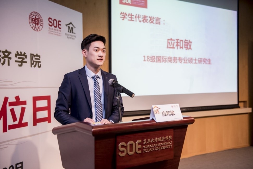 2018级国际商务专业学位硕士研究生应和敏同学作为学生代表发言。首先,他对学院及今天出席活动的各位嘉宾致以崇高的敬意和衷心的感谢。他认为,学院十分注重国际化专业人才的培养。通过第一年的海外学习,培养了学生自身跨文化交流的能力和广阔的国际视野。第二,他对学院设置的实务模块课程表达了充分的肯定。他认为,这些实务课程是名家讲坛、学术讲坛的优质补充,双导师机制更是锻炼了理论与实践相联系的能力。第三,他表达了对追求自由无用灵魂的看法。他认为读书是为了自己独立的生命体验,为了有更大的思想自由。自由并非无用,以经济的视角看待生活,带着经世利民心态才能让自己走得更远。最后,他以梁启超先生的一句话作为结语——“纵有千古,横有八荒。前途似海,来日方长。”并由衷表示,希望多年以后同学们能向学院证明,学院的选择没有错。
