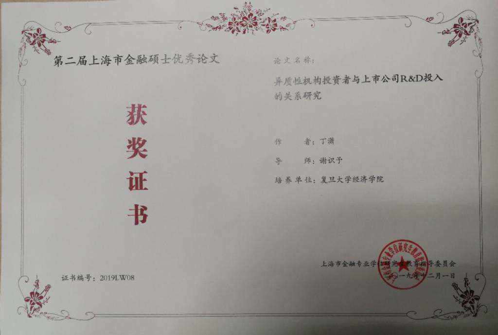 2019年12月1日上午,从上海市金融专业学位研究生教育工作会议上传出喜讯:谢识予老师指导丁潇同学撰写的《异质性机构投资者与上市公司R&D投入的关系研究》在第二届上海市金融硕士优秀论文评选中荣获优秀论文奖。