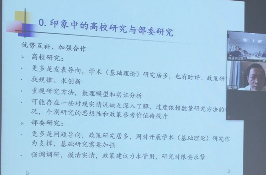 在张金清教授主持下,中国人民银行金融研究所副所长莫万贵先生做了《当前经济金融中值得研究的问题》远程在线主题报告,并与学院10多位金融学科教师进行了远程会议交流。莫所长从央行部委研究与高校学术研究的比较视角出发,就全球化发展趋势和国际经贸规则重塑、宏观经济政策框架的演变、中小微企业融资的机制设计、科创金融四大主题中值得研究的问题分别展开做了深入细致的分析,并提出希望高校的基础性学术研究能与政策部门问题导向型的对策研究能有效结合,共同对困扰中国当前的经济金融问题展开更具有针对性和深度的前沿性研究。会议交流环节,莫所长就中国当前的财政赤字货币化、LPR定价机制、央行关注的研究重点与《金融研究》期刊的选题等与10多位我院金融学科教师进行了热烈的讨论和交流。