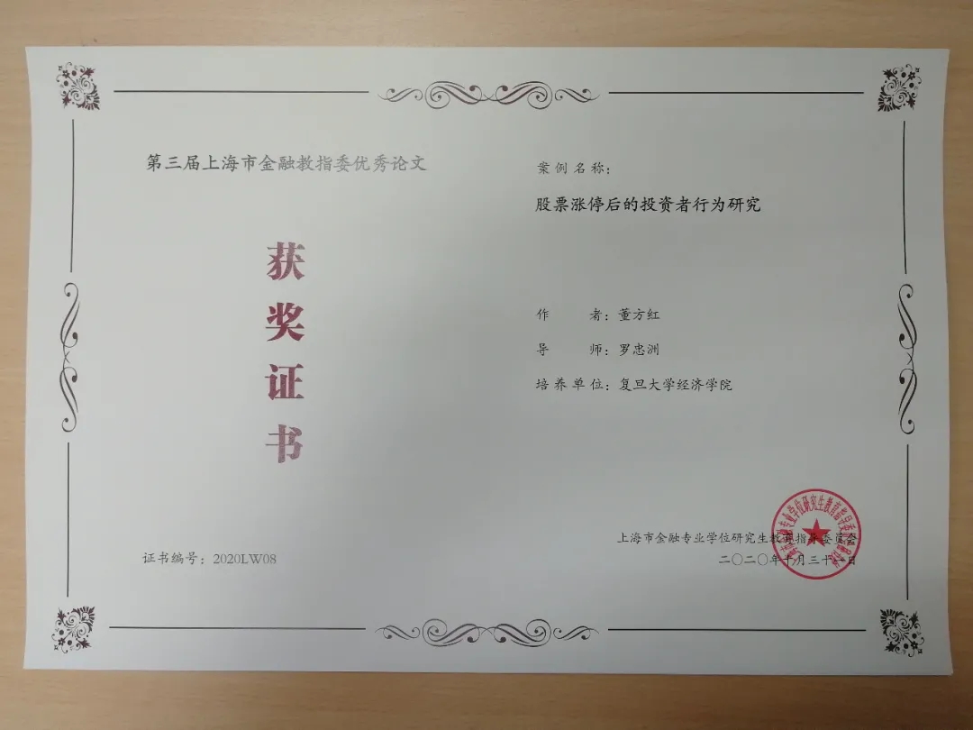 由宋军老师指导王禹涵同学撰写的《基于Barra模型的上市公司净经营资产因子及投资策略研究》,蒋祥林老师指导郑琳凯同学撰写的《模型不确定性下的全球资产配置》,罗忠洲老师指导董方红同学撰写的《股票涨停后的投资者行为研究》在第三届上海市金融硕士优秀论文评选中荣获优秀论文奖。