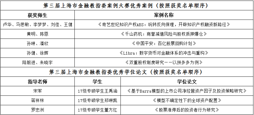 黄明老师、陈恩撰写的《千山药机:商誉减值风险与股权质押爆仓》,卢华老师、马思敏、李梦梦、刘佳、王健撰写的《奇艺世纪知识产权ABS:玩转反向保理,开辟知识产权融资新路径》,陆前进老师、朱晓宇撰写的《双重股权制度研究——以拼多多为例》,孙琳老师、潘欣撰写的《中国平安:百亿股票回购计划》,孙健老师、徐辉撰写的《Libra:数字货币对金融体系的冲击与重构》在第三届上海市金融教指委案例大赛中获得优秀案例奖。