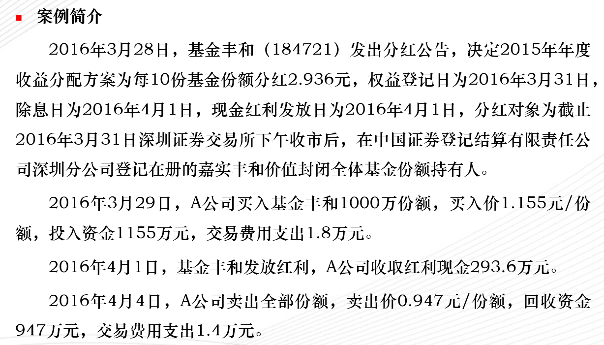 在第一个案例中,A公司收到的红利收入符合“对投资者从证券投资基金分配中取得的收入,暂不征收企业所得税”的规定,予以免税。而另一方面,基金在分配完红利后价格会下跌,A公司在仅持有该基金几天后就将其售出,且卖出价低于买入价,进而形成了投资损失并税前扣除。