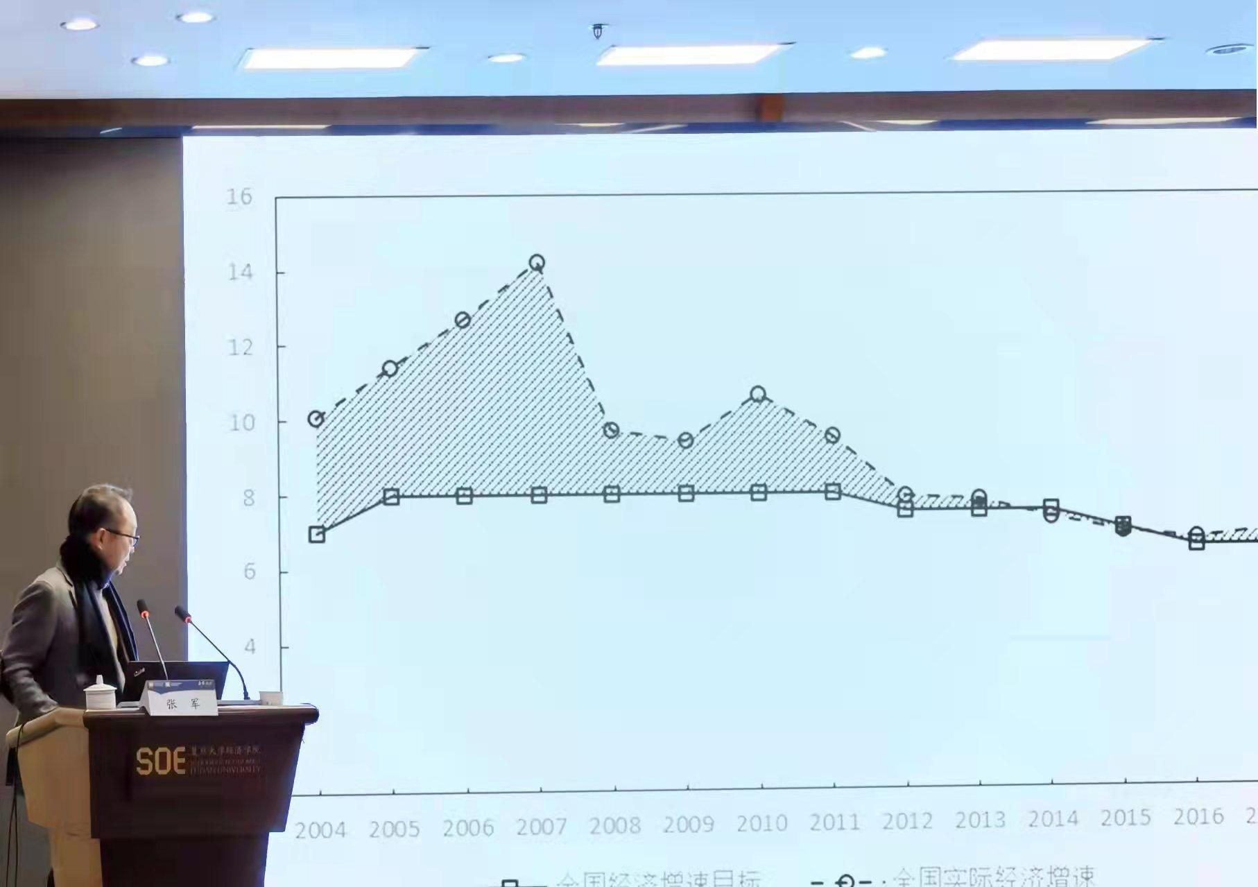 讲座伊始,张老师从当下市场分析师们对我国今年GDP增速目标的猜测说起,从时间维度分析了本世纪以来我国GDP实际增速和政府目标值之间的变动关系。他发现,在2012年以前的10年,中央政府设定的GDP增速目标都为8%,而实际的GDP增速均远高于目标,甚至在2007年超过目标值的6个百分点。将这10年的实际GDP增长率进行平均,可大致得到我国当时潜在的增长率超过了9%。2008年全球金融危机之后,为了应对外部冲击,我国出台了大规模内需刺激政策,加大财政支出力度,并通过融资平台鼓励各级政府放量信贷,支持和扩大基建投资规模。这一应对经济危机的常规举措,使得已经过热的经济热上加热,难以为继。2012年开始,中央政府开始调控过热的经济,并主动调低GDP增速目标至7.5%。而到了2014年之后,新一届领导人决定改变增长方式,从长期以来刺激需求转变到以去杠杆和去产能为主要内容的供给侧结构调整。从那之后,中国经济开始面临紧缩性和约束性的政策环境,增速持续放缓。由于地方之前那种增长冲动不再受到鼓励,每年的GDP增速也便不再高于增长目标,这在很大程度上导致中央政府设定的GDP增速目标也开始被动地逐年向下调整。