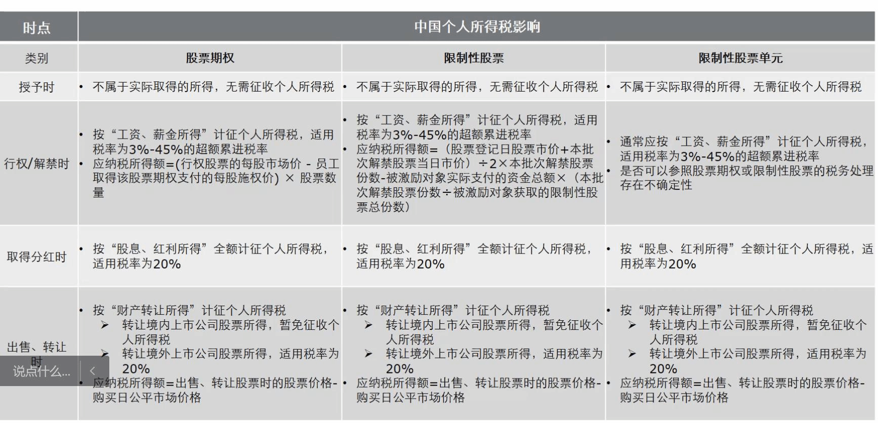 在分析“股权激励”未来发展的政策基调后,李老师介绍了常见的三种股权激励工具:股票期权、限制性股票和限制性股票单元,并阐述了这三种不同股权激励工具的纳税注意事项。其中,在税务优惠政策上,以股票期权为例,一般情况下需要缴纳两次税收,但如果可以适用优惠计税办法,则只需在转让时以转让价格减去行权市价计税即可。在监管收紧的大环境下,国家税务总局的监管对企业的人力资源管理提出了更高要求,包括税务备案等级是否及时、优惠计税办法的适用是否合规等。