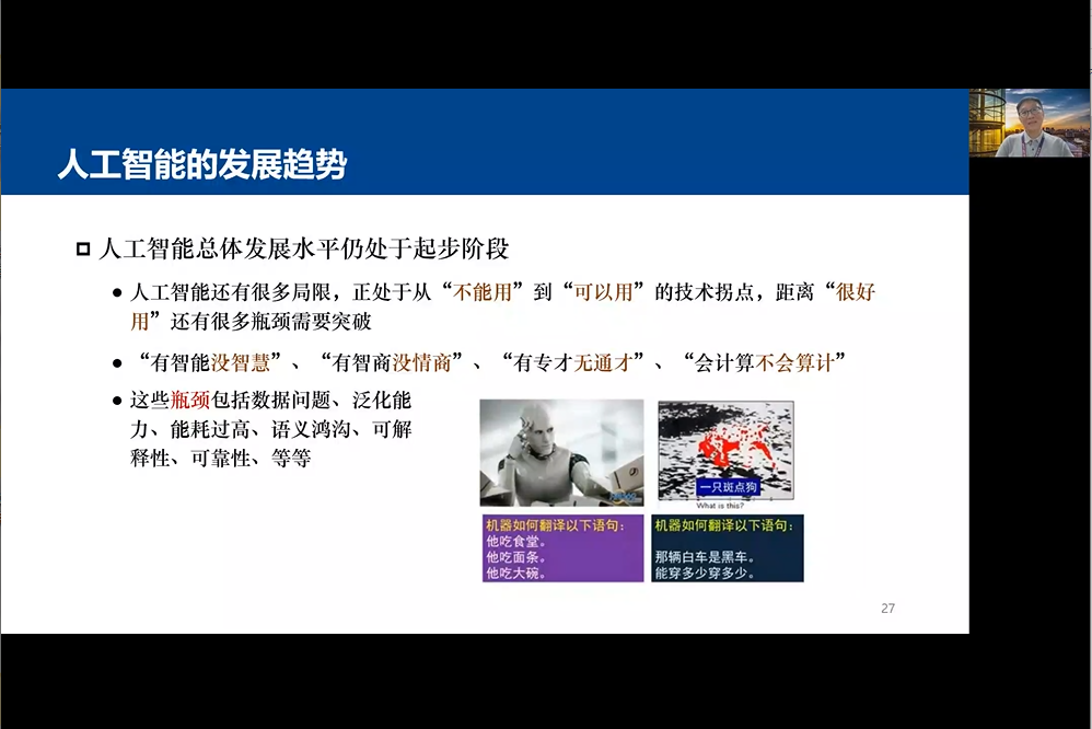 接着,他从概念、技术、目的、表现形式等多个方面对人工智能进行了系统介绍,分享了“连接主义”和“符号主义”在人工智能发展史上的波折发展,归纳了人工智能的发展特点和趋势。他认为,尽管历年来人工智能技术快速向各行各业渗透融合,逐步产业化,但其总体发展水平仍处于起步阶段,且还面临着诸如数据问题、泛化能力、能耗过高、语义鸿沟、可解释性、可靠性等多方面的挑战。