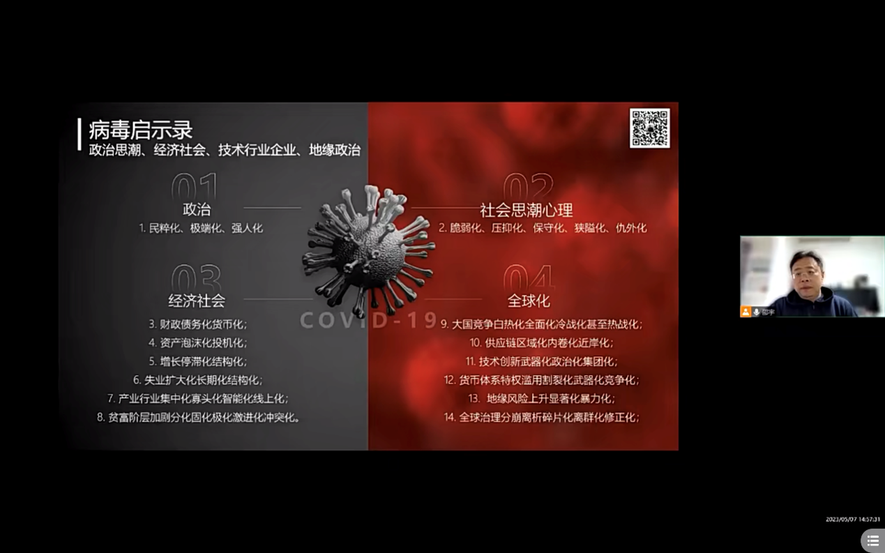邵宇博士发表了题为《后疫情时代:大趋势和新希望》的主题报告,从政治、经济、军事、企业、行业等多个角度对未来宏观经济发展进行了分析。邵宇博士认为,疫情后不可逆转的趋势变化将对政策抉择产生影响,并对各个行业不同人群的福利变化造成影响。新冠疫情期间,房地产、互联网、金融、教培等赛道发生了巨大变化。邵宇博士讲述了该如何顺应潮流从而做出行为优化。由于疫情投入的货币资源与财政资源已达到峰值,如何将资源配置在更有机会的区域行业领域,并从中分享新一轮中国增长的红利,怎样通过优化资源配置进行投资分析,也是邵宇博士在报告中所关注的问题。邵宇博士的报告为参营同学提供了深刻的思考和指导。