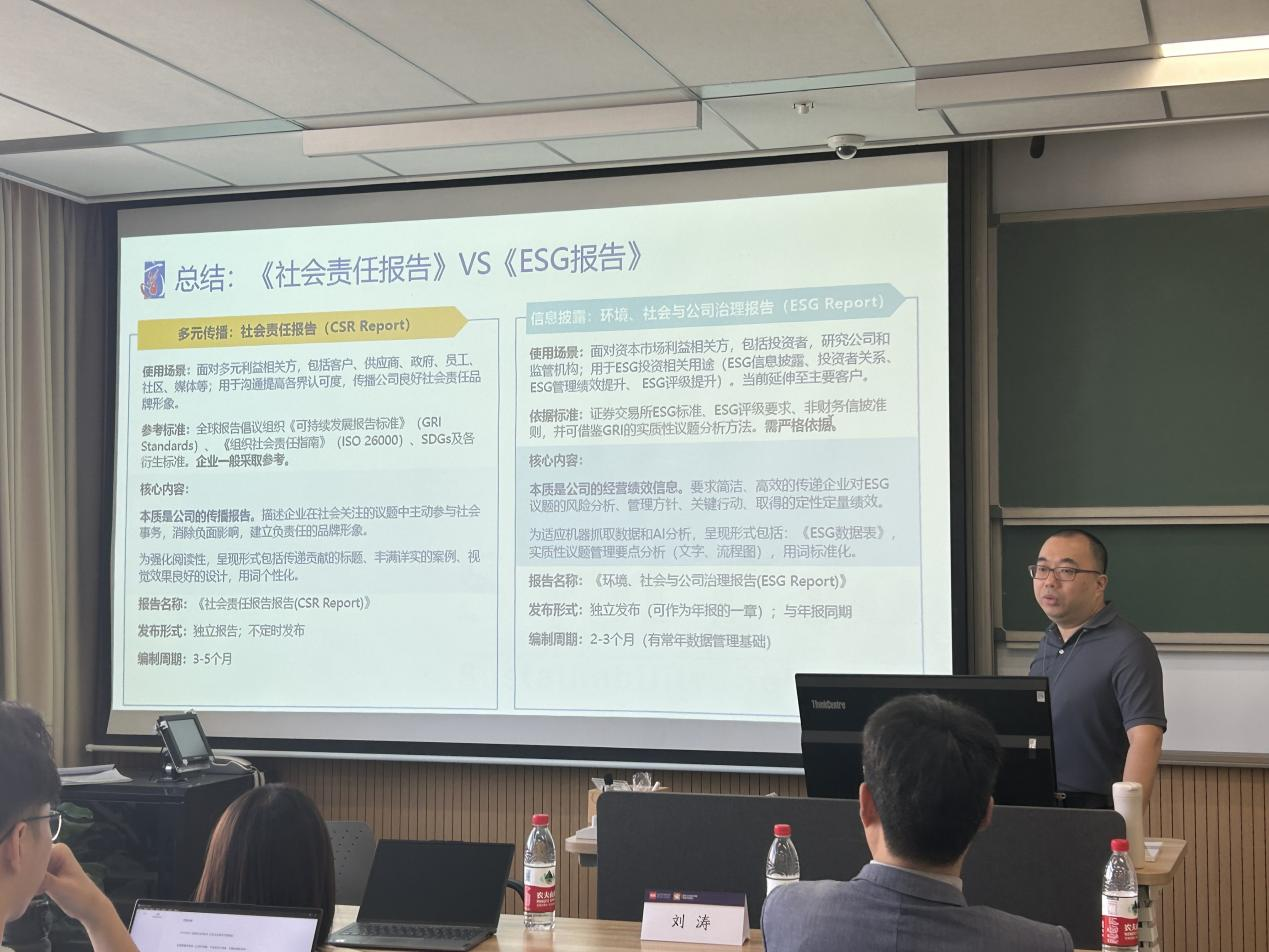 然后,刘老师分析了ESG报告的应用趋势及编写要点,他认为,缺乏可靠的ESG信息是金融机构投资者当前遇到的瓶颈。通过介绍ESG报告的两大使用场景,即供资本市场及投资者分析价值和帮助供应链判断ESG绩效,刘老师讲解了如何编写对资本市场和企业管理有价值的ESG报告,并指出ESG报告的编写要点在于体现实质性议题、以《ESG数据表》为核心且应配合详细附注等。