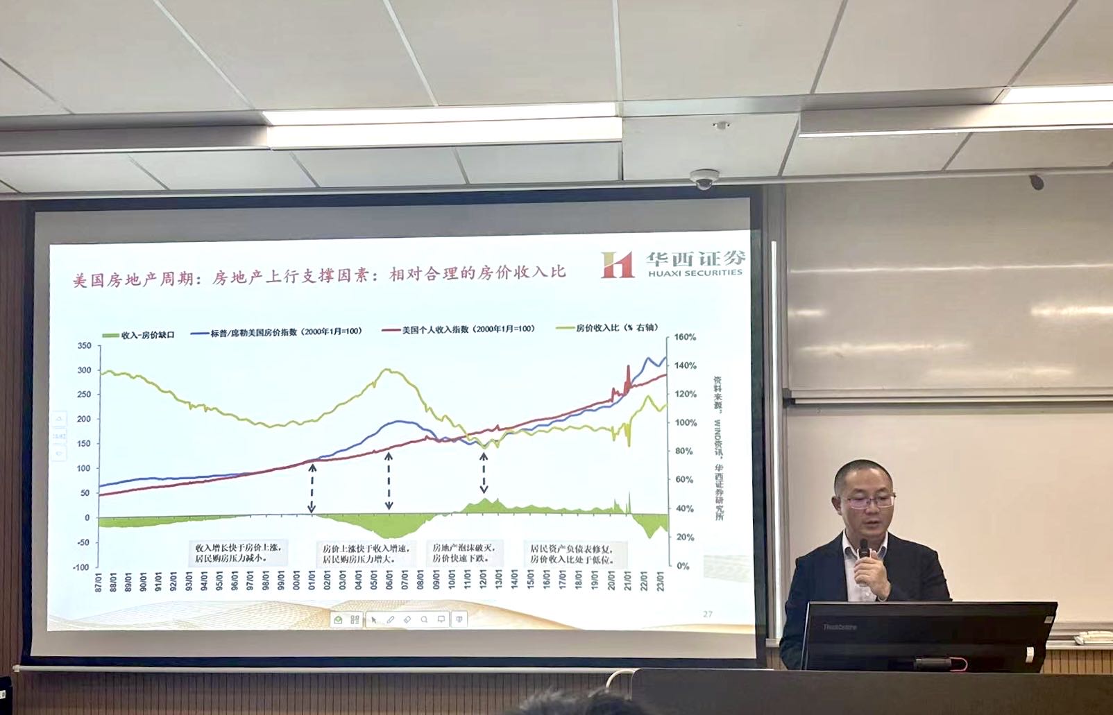 在第一部分,孙老师分析了海外市场宏观经济基本面,聚焦在欧洲和美国加息末期的全球资产表现。孙老师指出,欧洲乃至全球经济受制于高成本冲击,疫后制造业景气度偏弱,其中德国制造业受俄乌冲突影响最大。孙老师认为,美国市场有三个支撑点有利于2024年的美国经济发展;第一是库存周期,美国去库存接近尾声,消费品制造业出现补库存迹象并能支撑美国经济,这对我国也较为有利;第二为房地产周期,美国房地产周期自2023年1月进入较短的上行周期,就房价与居民收入比来看,美国超额储蓄叠加较高的工资水平能够支撑房地产上行;第三为财政,美国财政因经济情况和2024年大选保持扩张以支持经济(财政赤字6%)。最后,孙老师预测了加息末期的全球资产表现。孙老师认为,由于加息末期经济热度维持与企业盈利良好,美股表现较好;市场若预期到美联储停止加息则美债利率将逐渐下降;此外,黄金转强、大宗商品表现震荡且新兴市场经济体受到冲击;人民币汇率压力将有所缓解。