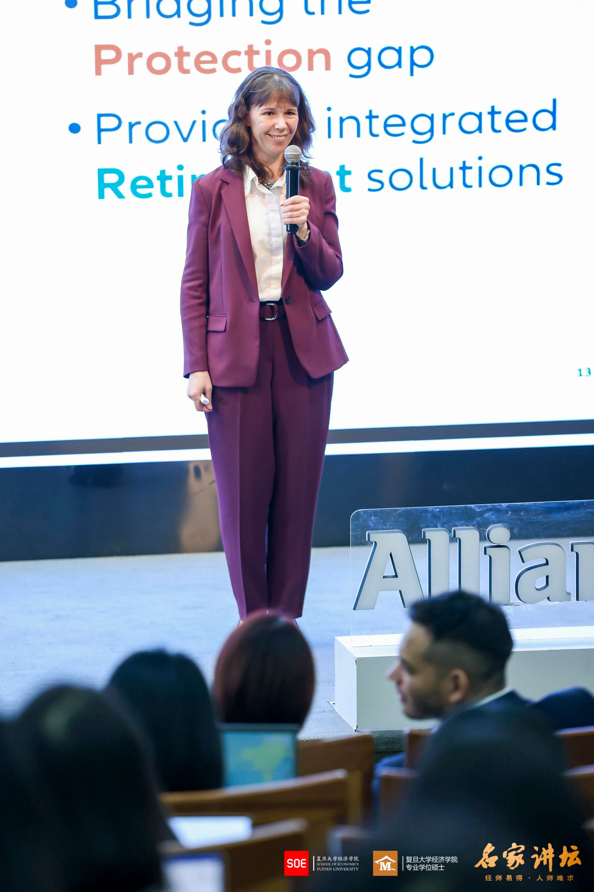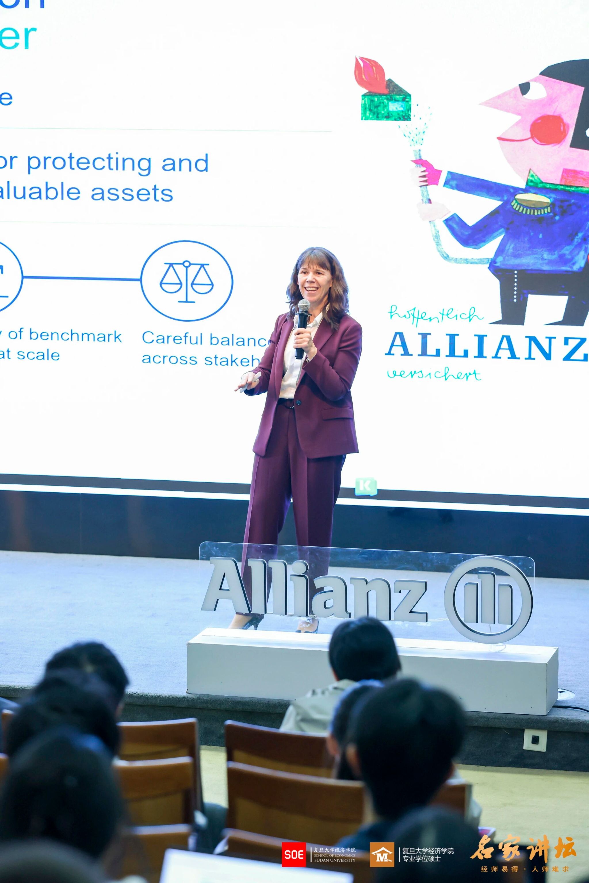 讲座伊始,瓦格纳女士简要介绍了安联集团的大致情况。安联集团成立于1890年,是全球领先的保险和资产管理公司之一,在全球近70个国家和地区开展业务。从财产险、寿险、健康险到救援服务、信用保险和全球商业保险,安联以“We secure your future”为宗旨,致力于为客户提供全方位的个人和企业保险服务。 公司注重长期发展,平衡员工、客户、社会及股东等所有利益相关者的关系。在亚太等新兴市场,安联业务增长显著,成为安联集团未来发展的中坚力量。此外,安联积极应对宏观趋势对保险业的影响,也通过赞助奥运会、拜仁慕尼黑足球俱乐部等提升品牌影响力。