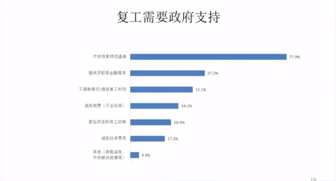 基于上万企业的调研,我们可以看到,尽快恢复物流还是最主要的。贷款和金融服务为第二,占37.2%。然后还有给企业灵活性,不要强制推迟或者提前复工时间,让企业根据自己的实际情况来开展复工;减免税费,特别是对所得税、收入税等等的减免;还有更加灵活的用工政策,因为有些地方回不来,有些地方的人又多了,像阿里出现借用员工的事件,很有意思一个创举;人口流动政策很重要,减免社保也很重要。