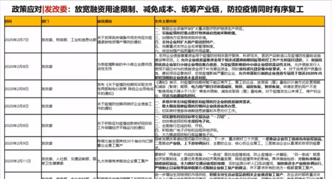 发改委从物资供应,对企业扩大再生产的需要,对电力的保障,对政府审批程序的减少和加快,然后对疫情期间的企业债券融资需求的支持,特别是推动企业员工错峰有序地返程和返岗,能够推动产业链上下游的协调运行,也出台了一系列的政策。