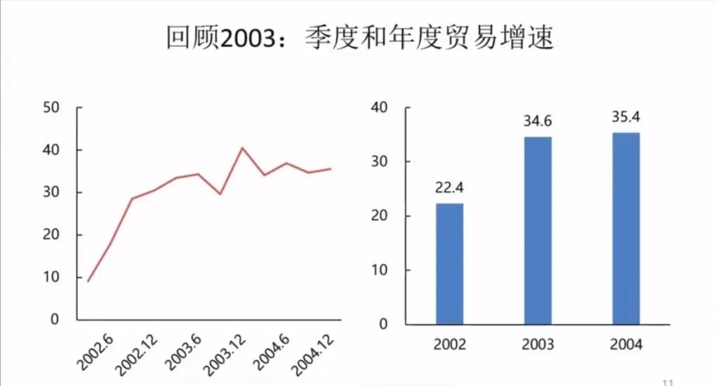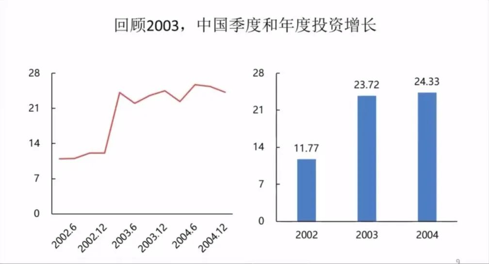 所以我们把这几个数据放在一起看,疫情在2003年有一个强劲的反弹。消费是一个比较困难的方面,靠投资、靠房地产、靠贸易,整个拉动。所以使得整个2003年经济继续增长,比2002年持平还继续增长。