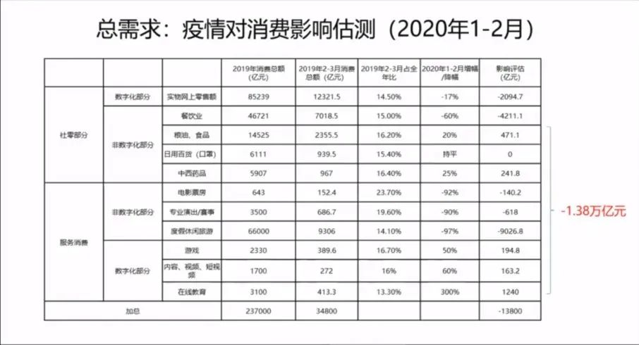 我们就“疫情对消费影响的总需求”做了一张估测表。我们看2019年的时候,我们国家总体消费是23.7万亿元人民币,零售部分,网上是8万(亿元),非数字化部分7万(亿元),所以现在出入都很大。但是服务消费大家可以看到是7万6(亿元),主要还是在线下,线上只有6100亿。
