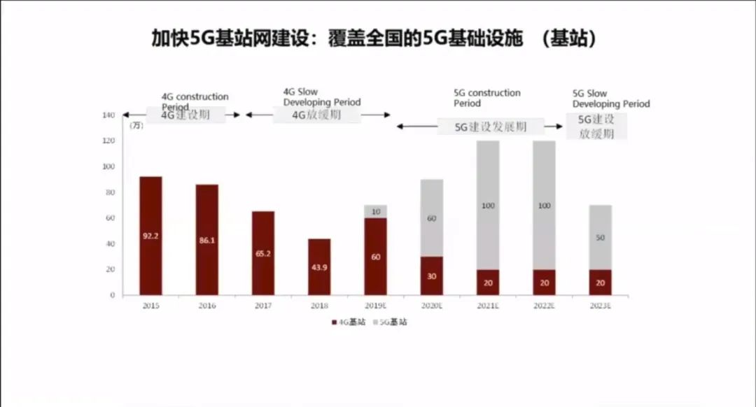 计划从今年开始大规模的推广5G(灰的是5G基站),发展也是5年的期间。但是疫情时期科技的发力,我们可以看到2020年完全可以把它作为一个5G的基础设施的发力阶段——大规模的5G基础设施投资。把5年的周期,提前做成一个3年的周期,既有宏观投资的经济推动作用,也有基础设施推动科技发展作用,一举两得。