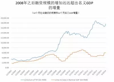 第一个就是,尽管GDP的增速下降到了6.5%左右,但社会融资规模增加依然保持了两倍于GDP增量的扩张趋势。这两者之间,现在开始严重分化,而在2008年之前,这个现象没有出现过。