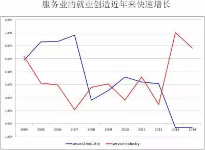 我的同事章元教授根据国家统计局的数据进行测算的结果显示,三个产业的就业在这几年发生了变化,能够发现经济结构的变化非常明显,在2010年的前后五年,制造业和服务业吸收的就业人口被倒过来了:制造业创造的就业明显在下降,而服务业创造的就业明显在上升。