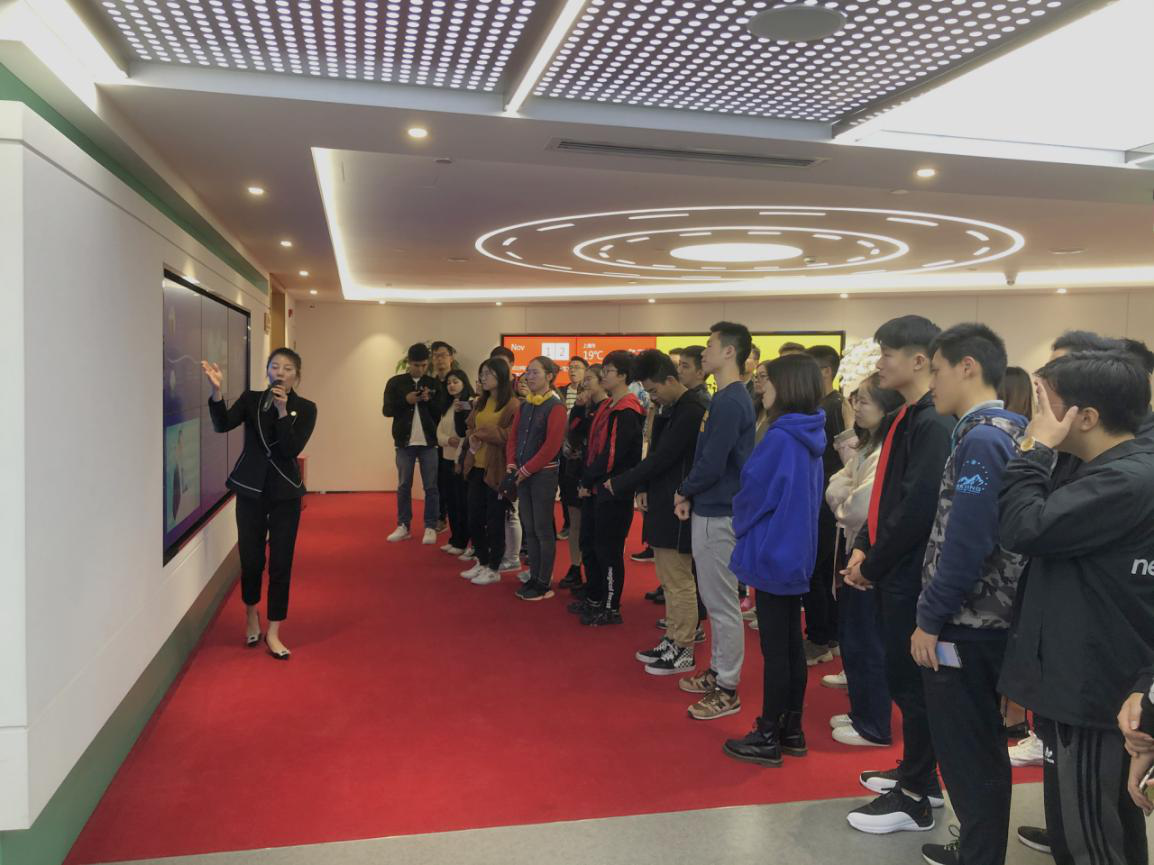 的学生们来到了位于申亚时代广场的美团点评集团进行参访和学习。在同学们到达目的地之后,讲解员以“我们”为主题,为同学们介绍了美团点评集团的由来和发展、其主要业务线和产品线、“以客户为中心,正直诚信,追求卓越,合作共赢”的价值观以及为社会事业做出的努力与贡献等等,并为同学们展示了企业独立开发的大数据系统和“美团大脑”知识网络,以短片的形式展示了无人配送车。