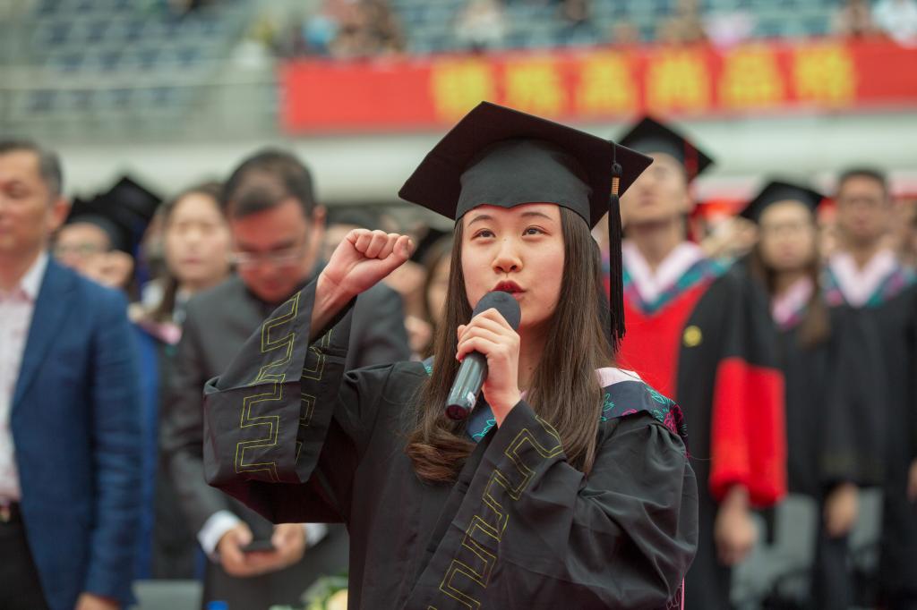 在激动人心的“立远志”环节中,由学生会主席余思娴同学领誓,全体毕业生庄严宣誓。誓词体现了经院人经邦济世的理想与情怀,博学笃志的自律与上进,一起为国奋斗、永久奋斗,不负党和人民期待、不辜负伟大时代的决心和斗志。