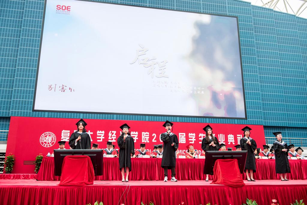上午九时,庄严的国歌拉开了典礼的序幕,国旗缓缓升起。伴随着一段毕业纪念短片,典礼进入第一个环节。在这个名为《毕业•启程》的短片中,同学们回顾了在复旦经院的青春岁月,分享了自己在学术道路、社会实践、文体活动和创新创业等经历中的成长和感悟,经院各个系所的教师代表也在视频中寄语毕业生,肯定了大家求学复旦经院的精彩与充盈,期待大家可以在未来的广阔天地大有作为,始终不忘责任与担当。