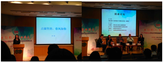 稍事休息后,会议进入圆桌论坛的阶段。蔡晓月老师以主持人的身份参加会议,并向四位参会嘉宾提出了一些同学们的问题,四位嘉宾也就同学们的问题进行了自己独到的解答。在解答找怎样的实习、如何规划这一问题时,四位嘉宾结合自己的经历为大家提出了几点宝贵的建议:一是人生规划不用过早可考虑;二是实习时尽量选择一些专业对口并且自己喜欢的实习期三个月以上的工作,重点是尽快找到职场的感觉,并且观察公司的文化氛围是不是适合自己;三是在就业时要善于从周围的团队、自己的领导身上发现闪光点,使自己的实习生活更加精彩。上午的最后每一位嘉宾以一句话的形式寄语同学,鼓励同学们趁年轻多学点自己感兴趣的事,不要怕摔跟头,不要不把自己当回事,也不要把自己不当回事。随后,蔡晓月老师宣布上午场活动结束,请大家用完午餐稍作休息后于下午2点准时开始下午场会议。