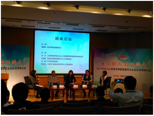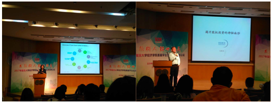 石磊老师并就“新经济如何更持久”这一主题做了主题演讲。演讲结束后,到会领导与参会嘉宾进行了集体合影。随后,四位参会嘉宾结合自己的经历为同学们带来了四场精彩的主题演讲。上海市银行同业公会人力资源管理专业委员会创始主任刘杰老师就职业生涯以“模式和资本”主题,通过讲解职业生涯发展的十个经典案例和职业生涯规划的三种模式,阐述了自己有关职业生涯的理解。随后安信信托股份有限公司人力资源总监孟晓焱老师做了“我的职涯我做主”的主题演讲。华为财经副总裁刘颖老师通过阐述“从金融到实业—才行职业多选项”,在分享个人经历的基础上,更分享了她自己关于职业规划的几点心得,赢得大家的阵阵掌声。最后上海申万宏源证券研究所人力资源总监为各位复旦的师弟师妹们分析了买方证券分析师的职业认识。