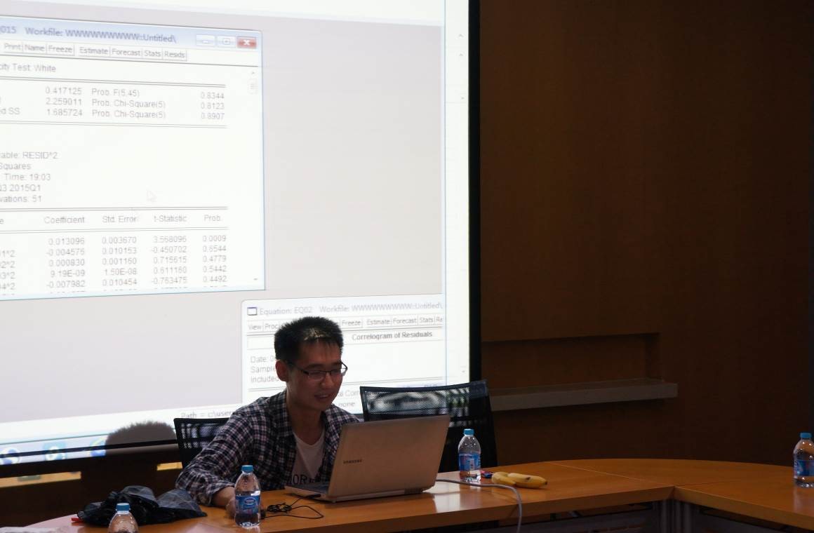 简短的开场白后,杨万成同学立刻切入正题,开始介绍Eviews 6.0软件的应用。他首先介绍了如何导入数据以及怎样进行基本的数据分析,然后以货币量和上证指数之间的关系为例示范了平稳性检验、单方程估计、异常值的处理(加入虚拟变量)、序列相关和异方差等常见问题。接下来,杨万成同学重点演示了Stata 12.1软件的操作,尤其是数据处理过程中需要用到的命令,例如如何修改文本形式的日期格式、如何对数据进行分类排序等。杨同学还介绍了用Stata进行回归分析的方法以及异方差等问题的处理。最后,他详细展示了如何用Stata编写程序进行事件研究。