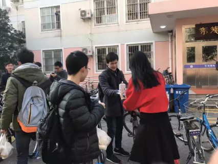 首先是早上的“送早餐”活动。每个男生寝室都为他们的联谊寝室精心准备了美味的早餐,不到八点钟就早早等候在女生宿舍31号楼下。大家首先在宿舍楼下拉起了横幅——“做我的小公主,只吃肉不吃苦”。