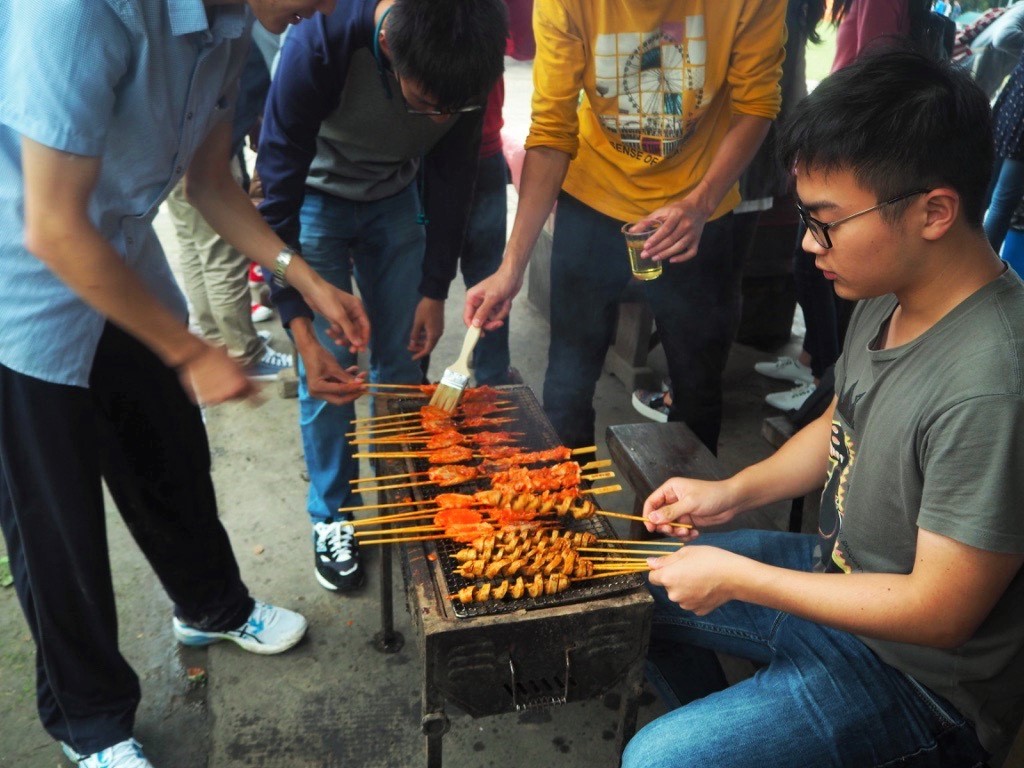 一来到森林公园,大家就坐上了白色的小火车,跟着火车的步伐在茂密的树林里前行。林间清新的空气扑面而来,真想来一个深呼吸,放松一下紧张的心情。林中轻松愉快的小火车之旅很快在大家的谈笑风生中结束,同学们到达了目的地——烧烤露营基地。在热切的期待之中,同学们分成四组开始烧烤。铺桌布、分食材、上调料、穿竹签……大家忙得不亦乐乎。