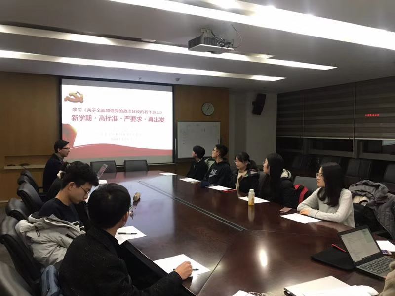 本科第二党支部于2019年3月3日积极开展有关学习《关于加强党的政治建设的意见》的小组活动。在“新学期,高标准,严要求,再出发”的主旨统领下,本次生活会分为支部概况介绍、支部成员介绍、学习《关于加强党的政治建设的意见》以及观影后讨论四部分。