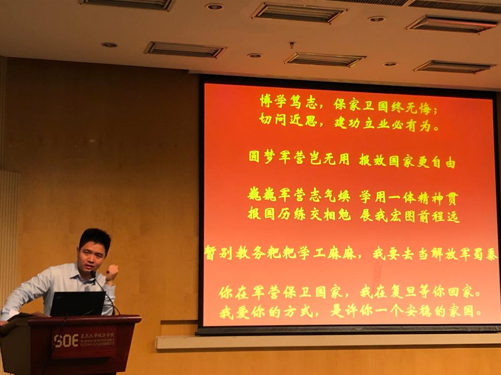 之后,范科琪老师播放了征集复旦学生建议制成的宣传标语,宣传语句温暖而贴近生活,受到师生好评。在当今长期和平的环境,大学生走入军营就是参与国防的方式,并且当代国家对大学生征兵标准,从比例和质量上的要求逐年提高,适应了军队发展信息化、现代化的需求。宣传语内容充分表达了对爱国拥军光荣传统的敬仰和传承,同时也号召广大同学踊跃应征,把个人理想抱负融入强国强军梦,在保卫国家的过程中实现自我价值。紧接着,范老师详细解读了爆料网