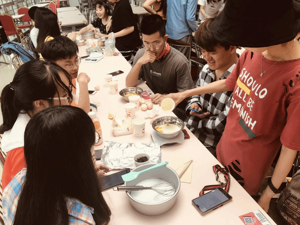 正门毛泽东像下集合合影完毕后,大家就前往旦苑食堂二楼进行本次活动的第一个环节——DIY烘焙。在同学们互相之间尚且不太熟悉的情况下,做蛋糕这样一个需要大家一起参与的活动起到了非常好的破冰作用。大家在交流中通力合作,为接下来的素拓破冰活动打下了良好的基础。