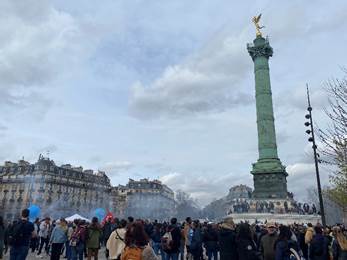 除了这种相对隐性的问题,出国交换还会面对不一样的社会运行模式。而在法国,我们经历的最大冲击当属罢工。3到5月一直在断断续续经历因为马克龙退休法案修改的余波,飞机、火车、公共交通一同瘫痪,只余几趟自动列车及巴士运行;政府机构不开,学校被占领,街道上停满了警车,银行的ATM和私营店铺的窗门都用木板封死,衣着鲜明、手持各种横幅立牌的人喊着口号唱着歌聚集在几个最具革命意义的地标:协和广场Concorde,巴士底广场Bastille、共和国广场République,民族广场Nation,然后沿着那些著名主干街道如Champs-Élysées从一个广场走去下一个广场。这种时候都是不便出门的,课程也都改成网课或时间调整。