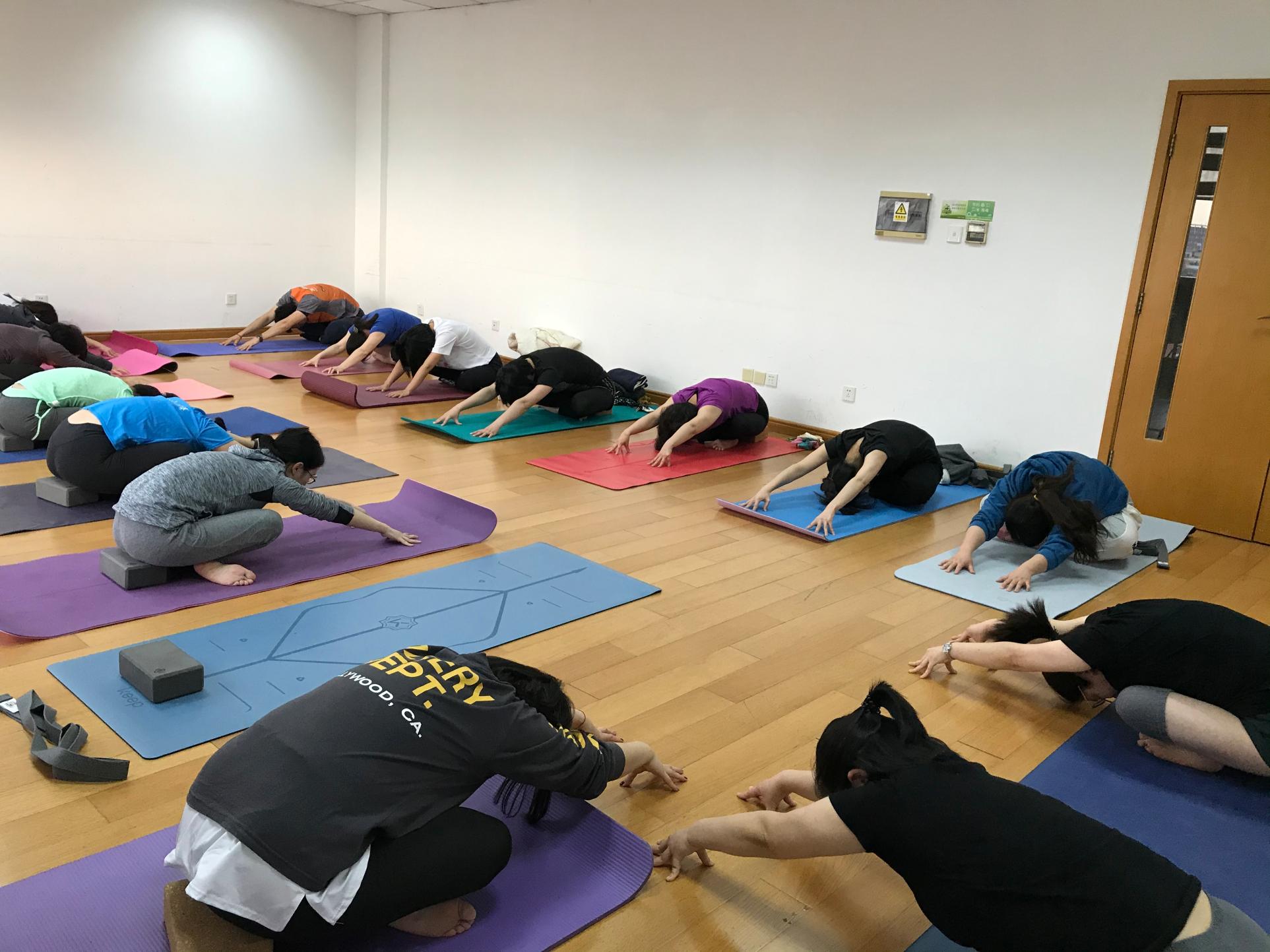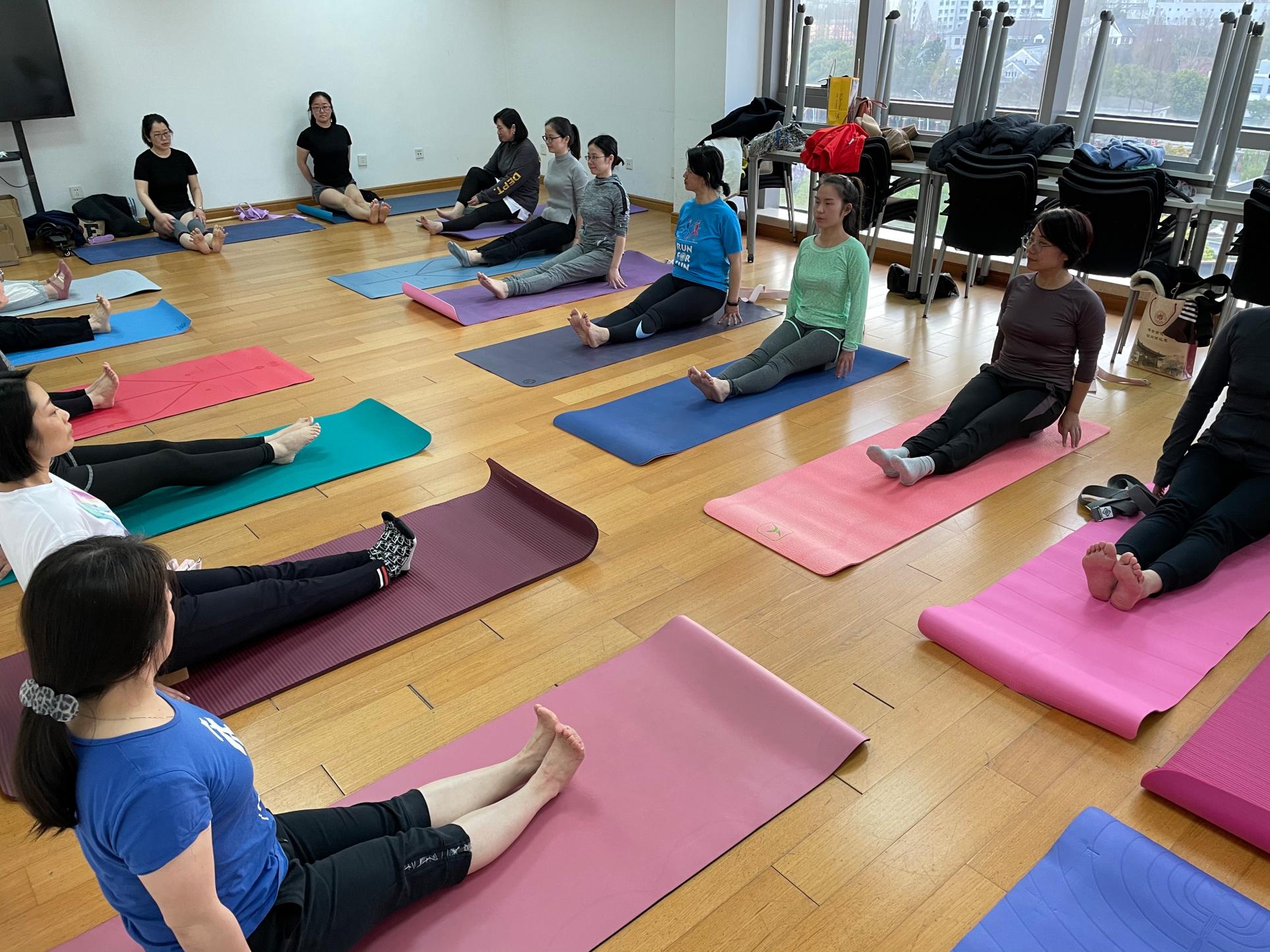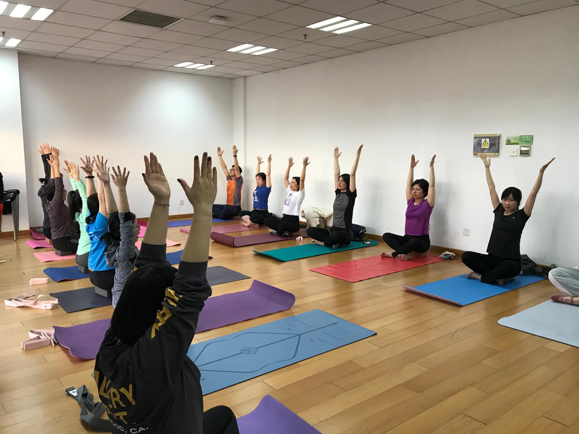 开班第一期,参与活动的学员们已将场地撑得满满当当。伴着轻柔的音乐,学员们在老师的指令下均匀调整呼吸、放松绷紧的神经,缓缓舒展身姿。一个小时的练习,学员们一个个红光满面,精神焕发。