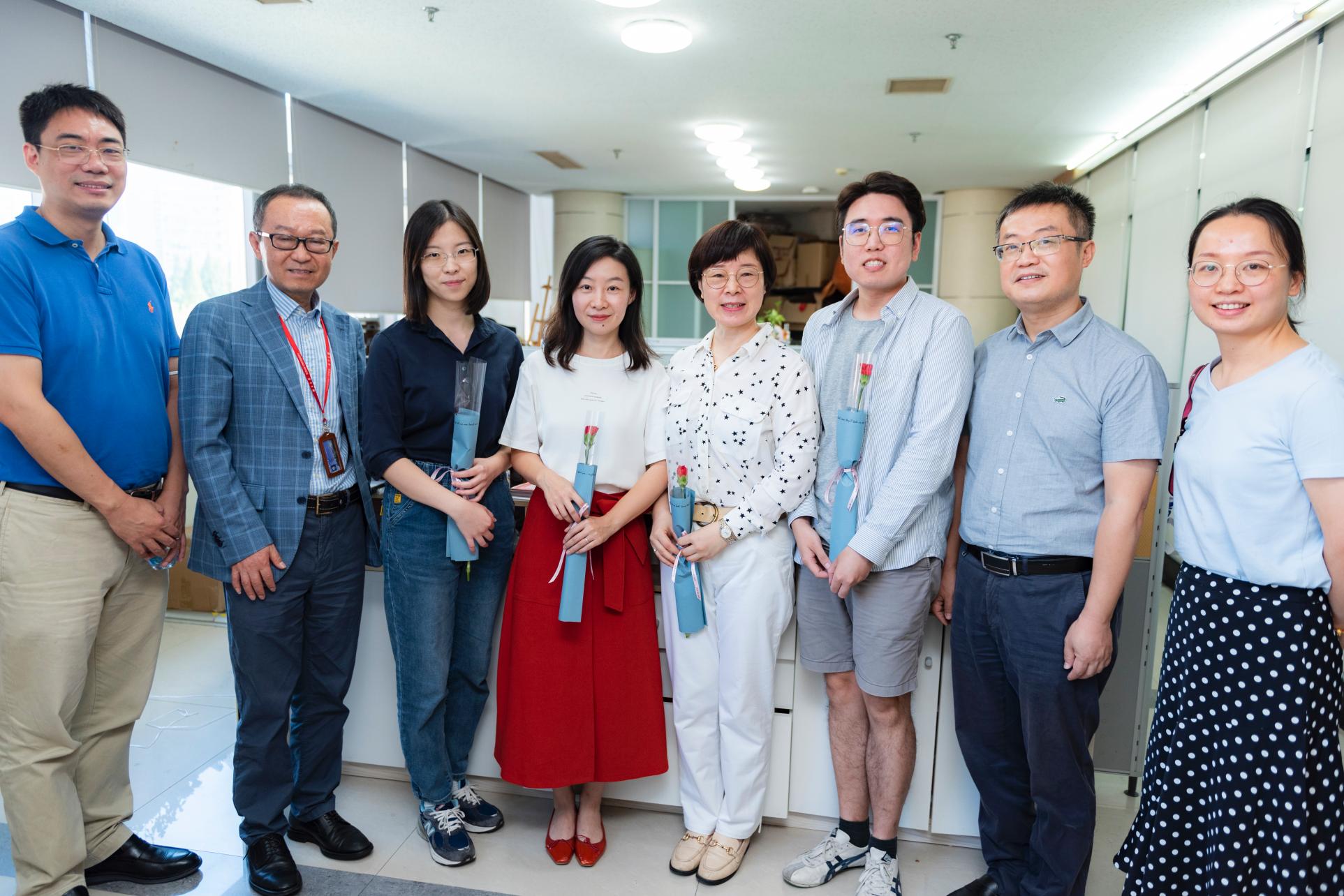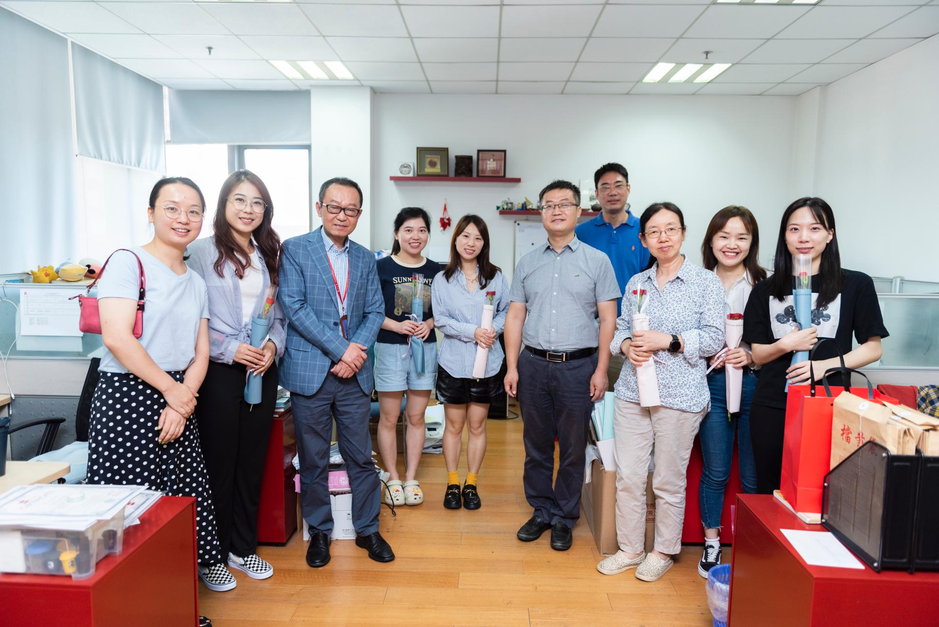 随后,慰问小组走进老师们的办公室,为正在办公的老师们亲手送上了慰问品和鲜花。张军院长、李粤江书记亲切嘱咐各位老师:当前常态化疫情防控形势依旧严峻,请大家在保证教学、科研等各项工作有序开展的同时,务必加强自我防护,确保身体健康平安。从领导手中接过礼物的老师们喜笑颜开,纷纷感谢学院的温暖与关怀,大家相拥在一起愉快合影,记录下此刻温暖的瞬间。