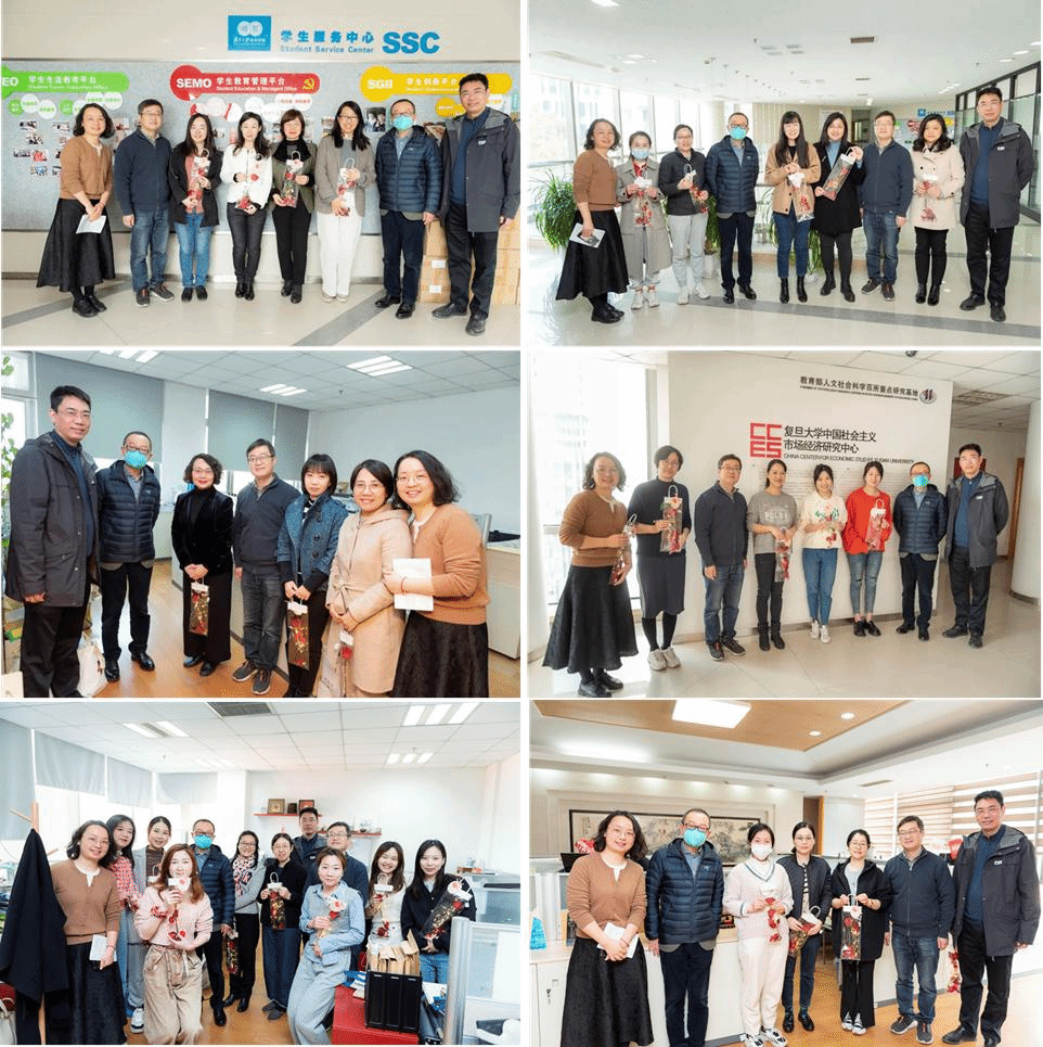 院长张军、党委书记李粤江、党委副书记李志青、工会主席詹璐及妇委会代表用鲜花,向奋战在教学、科研、行政服务的女教职工送上了诚挚的节日祝福并合影留念。明媚的阳光洒满学院的角落,盛开的鲜花传递着温馨的祝福。