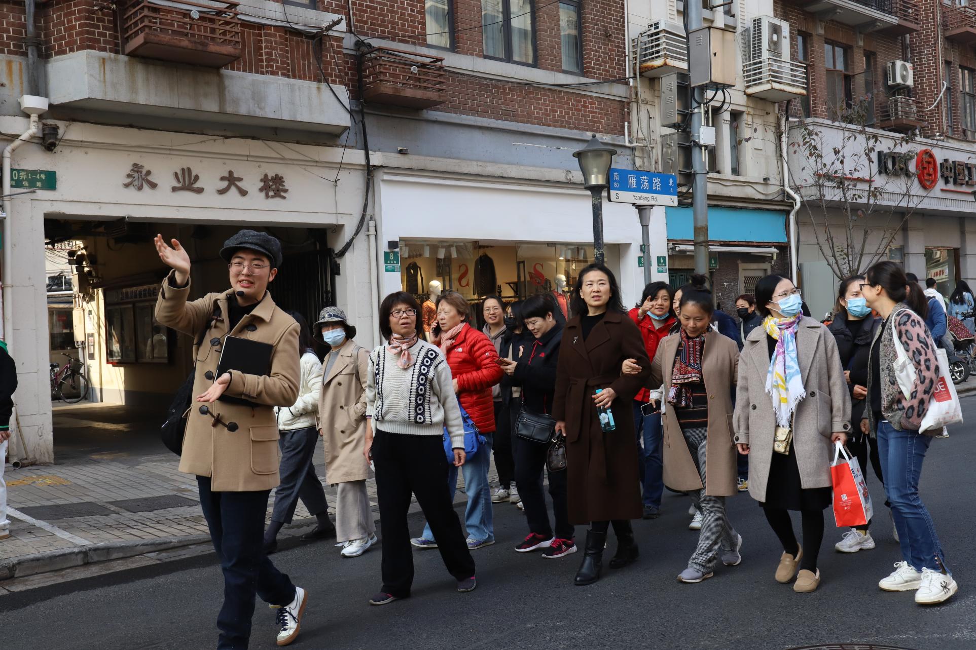 的2020级本科生高一崴担任导览者。在活动中,他深入介绍了各个景点的历史背景和建筑特色,也分享了身为区域“原住民”的日常生活趣事,帮助教职工学习和了解上海历史文化,共同回味过去时代的生活氛围。通过参加这次活动,教职工们感受着建筑的灵魂和岁月的沉淀,体验着上海这座城市的多元文化和历史底蕴,以及这座国际都市的城市脉动和生命活力。